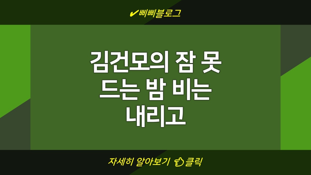김건모의 '잠 못 드는 밤 비는 내리고'란 곡은 정말 감성적이고 매력적인 노래야. 이 노래의 가사도 너무 좋고, 비 오는 날 듣기 딱이더라구. 이 곡을 듣고 있으면 감정이 복잡하게 얽히면서도 위안이 되는 느낌이야. 그리움과 슬픔이 섞여 있는 가사가 인상적이야. 유튜브 링크를 통해 연속으로 들을 수 있으니까 꼭 들어보길 추천할게. 링크는 여기야: