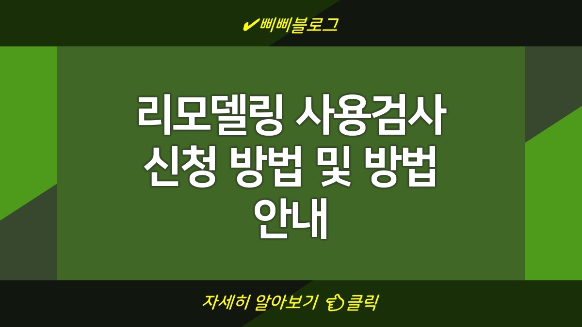 리모델링을 하려면 사용검사를 신청해야 해. 사용검사 신청은 건축물의 리모델링이 완료된 후 적법한 절차를 거쳤는지 확인하는 과정이야. 이때 필요한 서류와 절차를 잘 확인해야 하니까 주의해야 해. 신청 방법은 온라인을 통해서 간편하게 할 수 있어. 하지만 필요한 서류 또는 절차를 미리 준비해두면 체계적으로 진행할 수 있을 거야. 후속 조치를 잘 하라고.